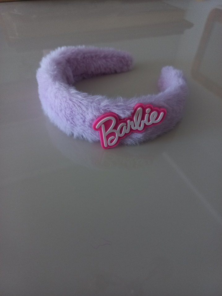 Mor kürklü saç bandı, renkli basılı Barbie logosu ile bohem ve retro tarzını yansıtıyor.