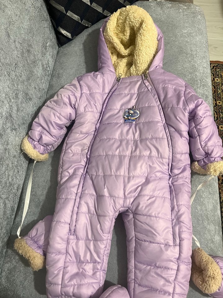 Pastel mor renkte, kapüşon ve manşetlerde kürk detaylı, notched lapel yakalı bebek kış tulumu. ❄️ birkaç kere kullandık kızım içinde durmadı tertemizdir
