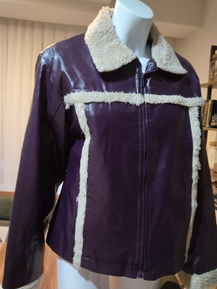 Parlak mor deri, kürk detaylı, yakalı ve uzun kollu, bohem ve retro tarzda, normal midi uzunlukta, dar kesim kadın ceketi.