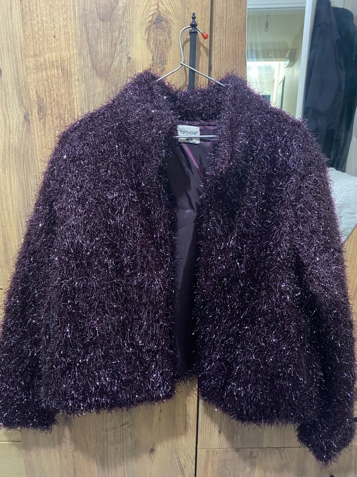 Mor renkli, kürklü detaylı kadın ceket, uzun kollu ve yaka detaylı, midi boyda, şık ve gotik tarzda parti için uygun. M beden ancak her bedene olur.