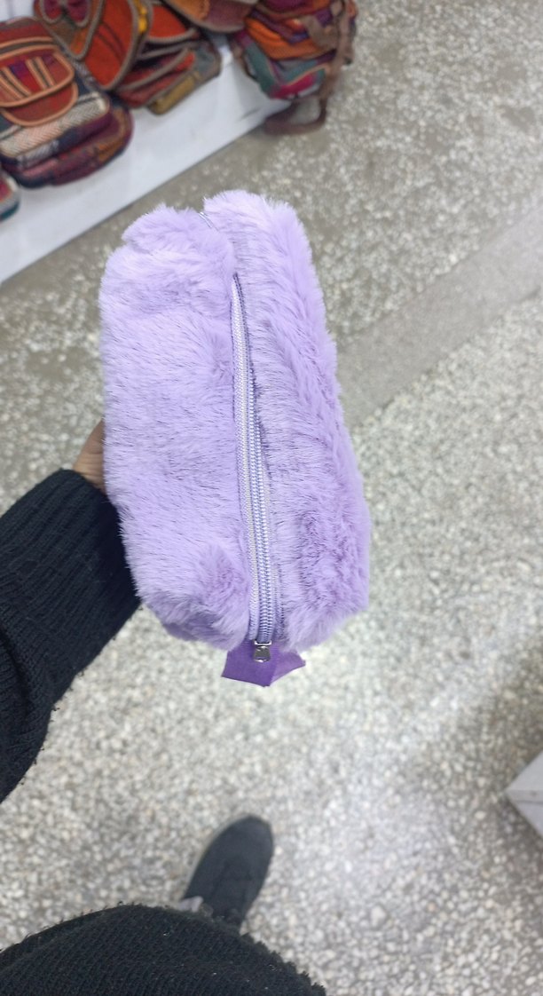 Mor renkli, kürk detaylı ve fermuarlı makyaj çantası. Rahat pastel tonlarda tie-dye deseniyle günlük kullanıma uygundur.