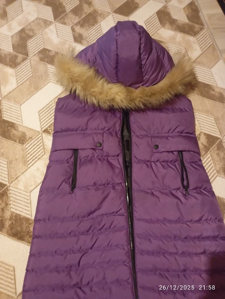 Mor kapüşonlu, kürklü ve şişme kadın yelek. Kolsuz, vücuda oturan ve midi boyda, sentetik kumaştan yapılmıştır. çok şık