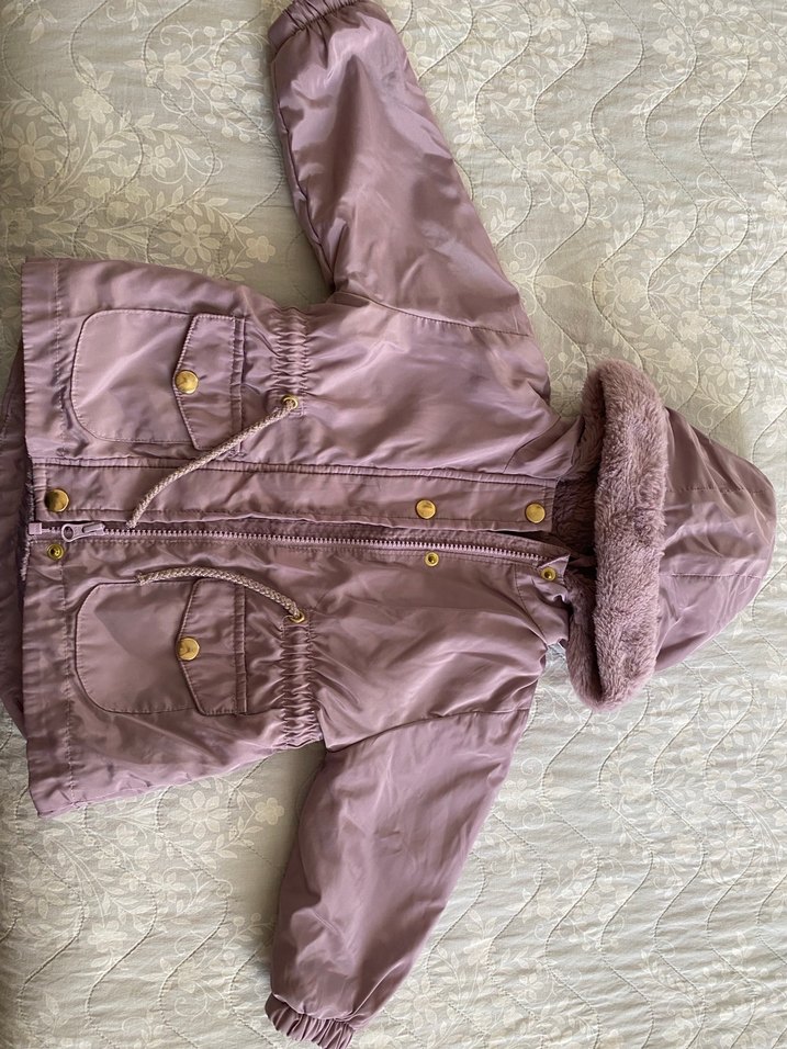 Mor renkli, kürklü kapüşonlu, sentetik kumaştan yapılmış, dar kesim kız çocuk montu. Notch yaka detayına sahip, sokak stiline uygun.