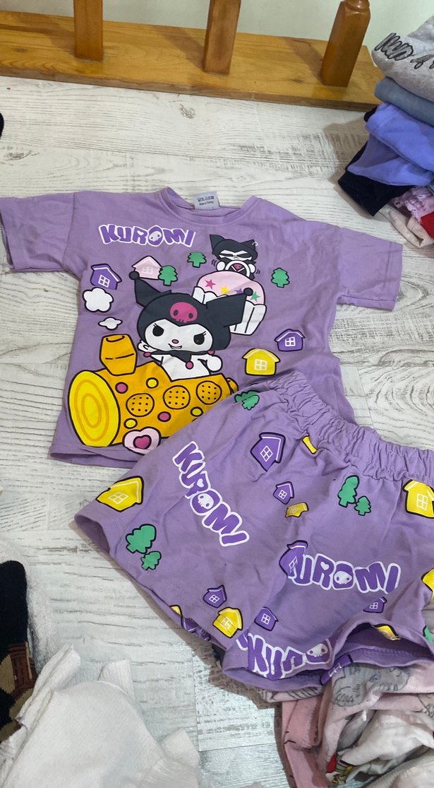 Pamuklu, yumuşak kumaştan yapılmış mor pastel renkli çocuk pijama takımı, baskılı Kuromi desenli kısa kollu üst ve şortlardan oluşur.