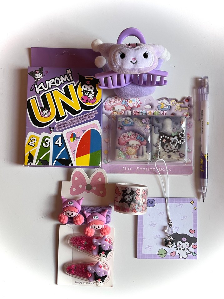 Pastel mor Kuromi temalı peluş toka, UNO kart oyunu, saç tokaları, kalem, kolye ve mini çıkartmalar içeren rock punk tarzı aksesuar seti.