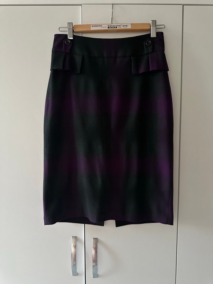 İpek gibi dokulu, mor tonlarında tie-dye desenli, kuşaklı ve vücuda oturan midi kalem etek. Ofis ortamına uygun goth iş tarzı.