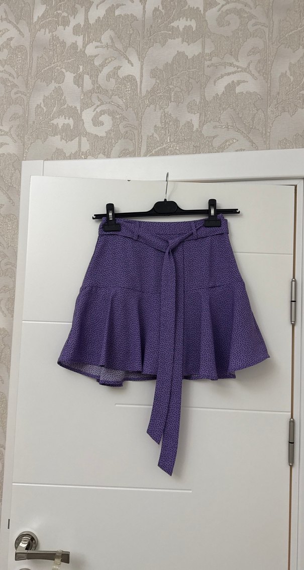 Mor renkte, kuşaklı ve bol kesim mini etek. Pürüzsüz sentetik kumaştan yapılmış, günlük sokak stili için uygun sade tasarım. İçi şortlu