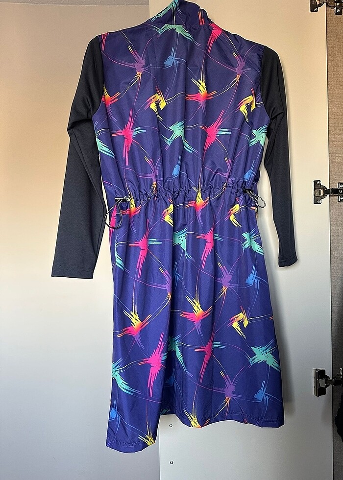 Mor detaylı rengarenk 3 parça tesettür haşema takımı-tam tesettür mayo takımı.lacivert detaylı pantolon tayt. Ürün sıfır. S beden. Ama M beden hatta L beden bile kullanabilir beli ayarlamalı olduğu için.İçi fileli.Belden büzgülü ayarlanabilir. Beden kısmı Paraşüt kumaş. Pantolon tayt oldukça esnek. Bonesi de içinde. İncecik bir kumaşa sahip. İç göstermez. Çok hafif bir ürün, hızlı kurur.
