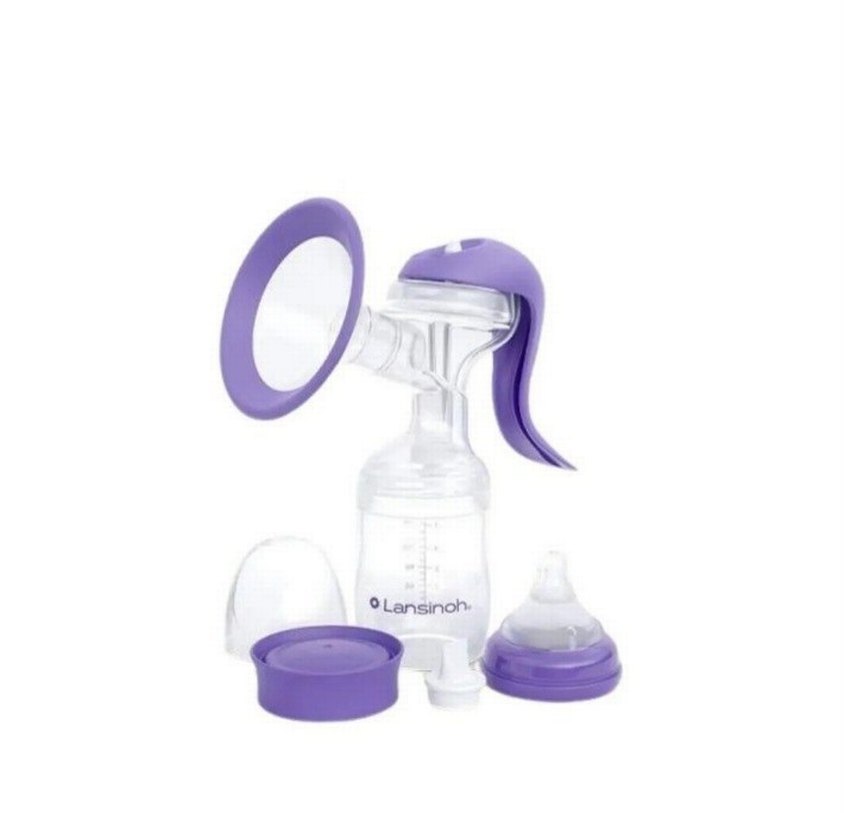 Lansinoh göğüs pompası açık mor renkte olup, şişe, emzik, kapak ve pompa kolu içerir. 3 ay kullanıldı