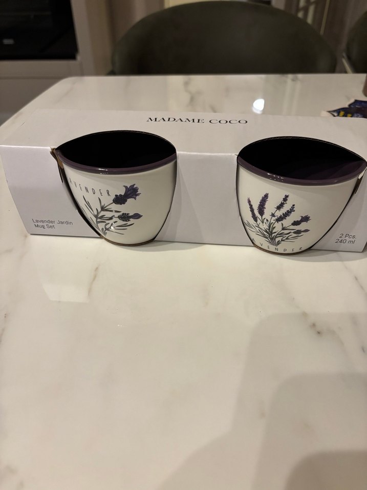 Mor iç yüzeyli, dışı lavanta desenli iki seramik kupa seti. Her biri 240 ml hacmindedir. ☕ madam cocı