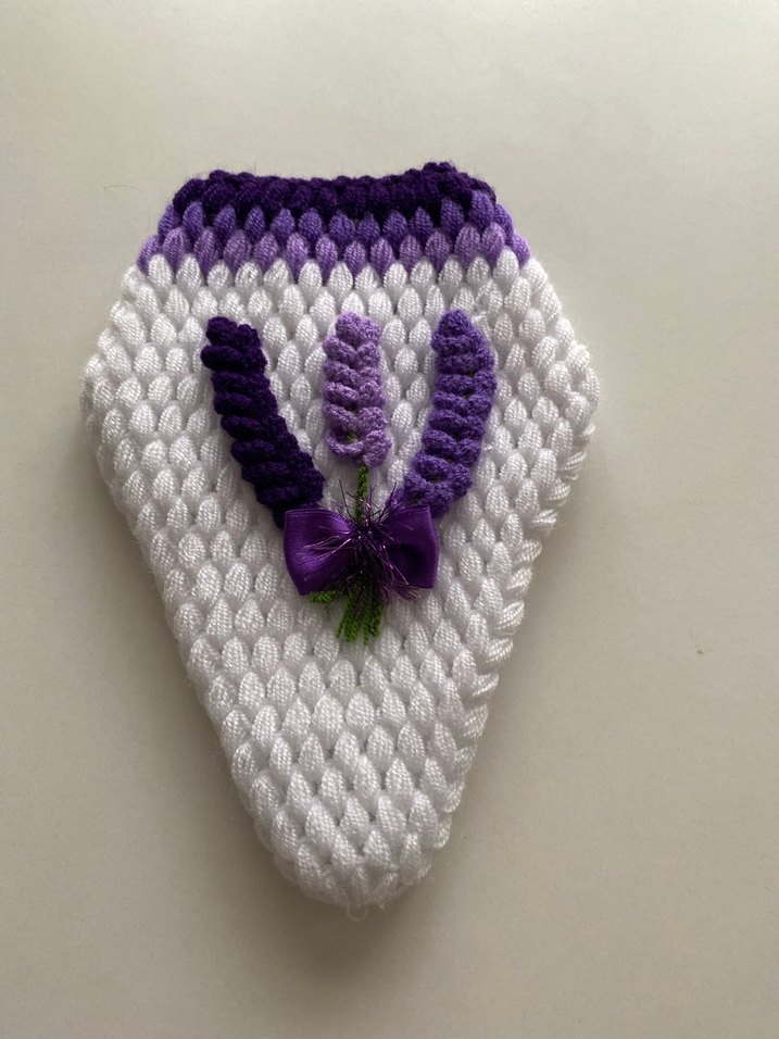 Mor ve beyaz renklerde, mor lavanta detaylı renkli banyo lifi. Yumuşak dokusu ile nazik temizlik sağlar.