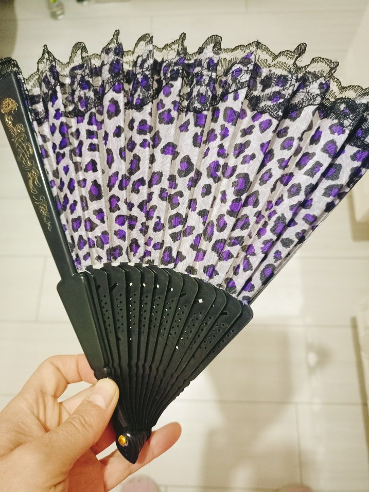 Mor leopar desenli kumaş ve siyah dantel detaylı katlanabilir yelpaze, şık ve kullanışlıdır.