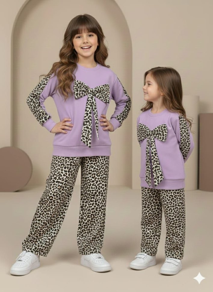 Bol kesim, uzun kollu ve bisiklet yaka kız eşofman takımı. Pastel mor üstü büyük fiyonk ve leopar desenli kollara sahip, altı leopar desenli pantolonla tamamlanmıştır. Yumuşak ve sıcak kumaş. ✨ En tatlı kombinleri burada! ✨ Yumuşacık bürümcük alt + rahat iki iplik üst takımlarımızla minikler hem şık hem sıcacık! ❄️ Fiyonk detaylı üstler Rengârenk ve canlı desenli altlar Günlük kullanım ve ev kombini için mükemmel! Pm763 Stoklar çok hızlı tükeniyor, mesaj yoluyla hemen sipariş verebilirsiniz! Bedenler: 3-4 / 4-5 / 5-6 / 7-8 / 9-10 / 11-12 Aynı gün kargo ✨ Kalite & rahatlık garantili