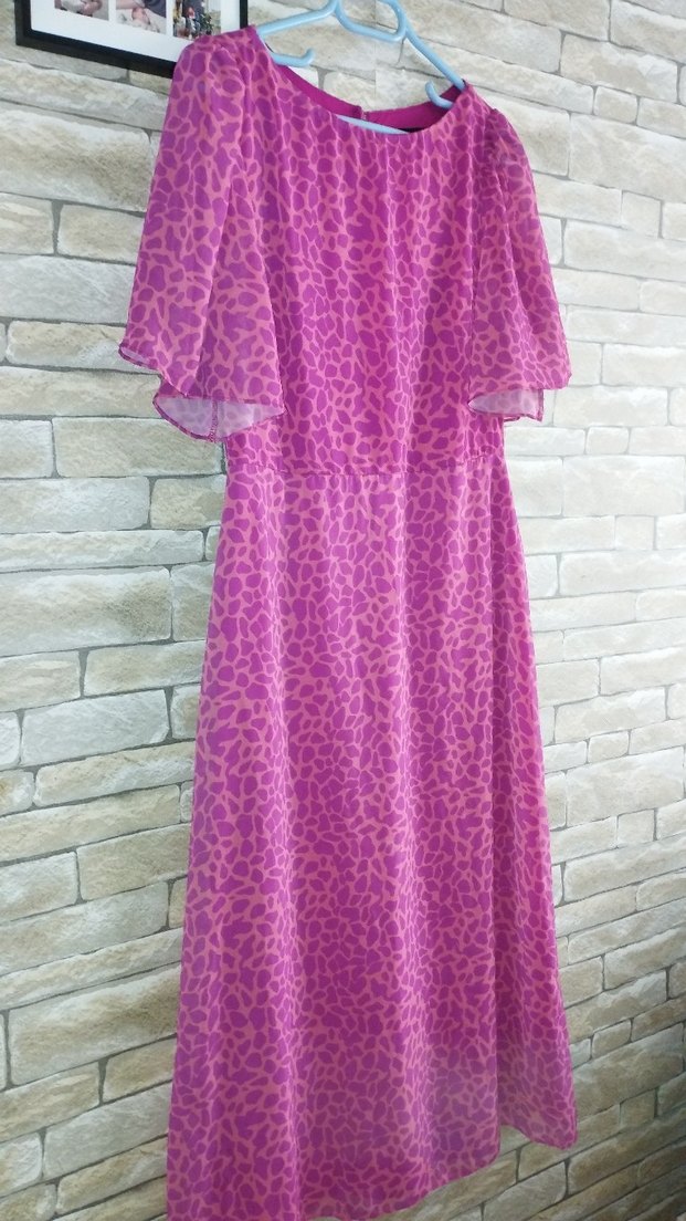 Mor renginde, uzun, drapeli ve leopar desenli bu elbise, askılı kol ve straplez yakaya sahip, bol kesimdir. Bohem tarzda parti için uygundur.
