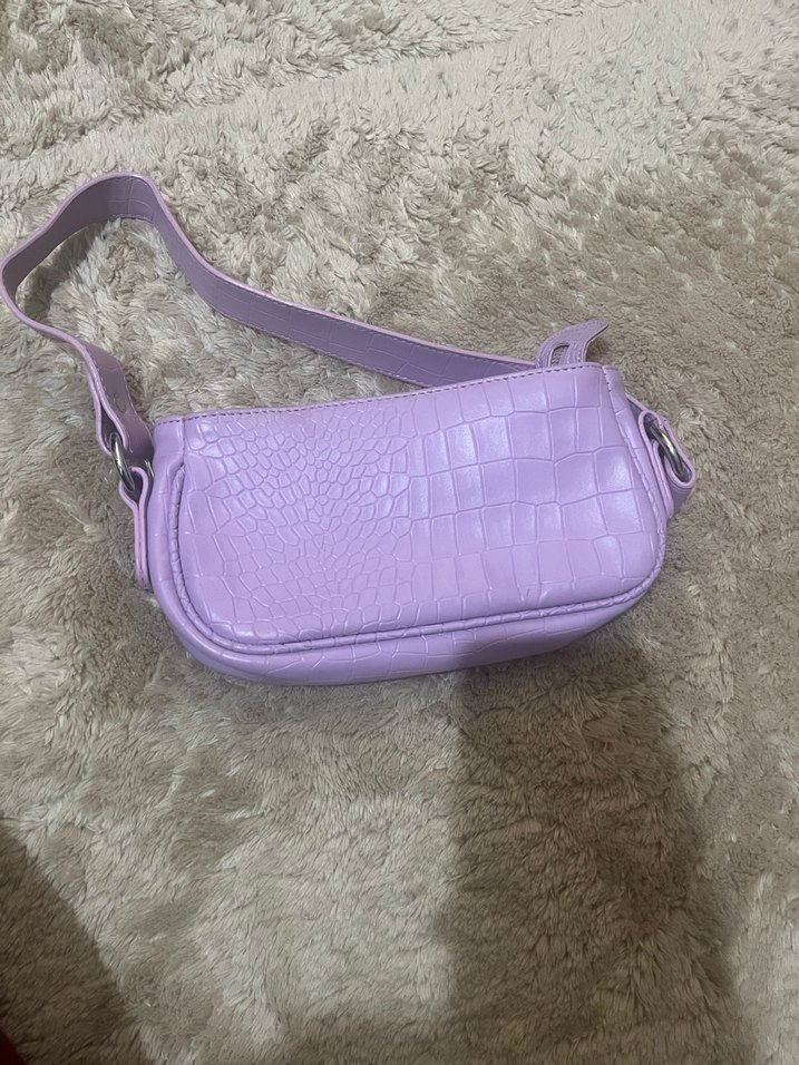 Pastel mor deri kadın çantası, tokalı askısı ve yılan derisi desenli dokusuyla günlük sokak stiline uygundur.