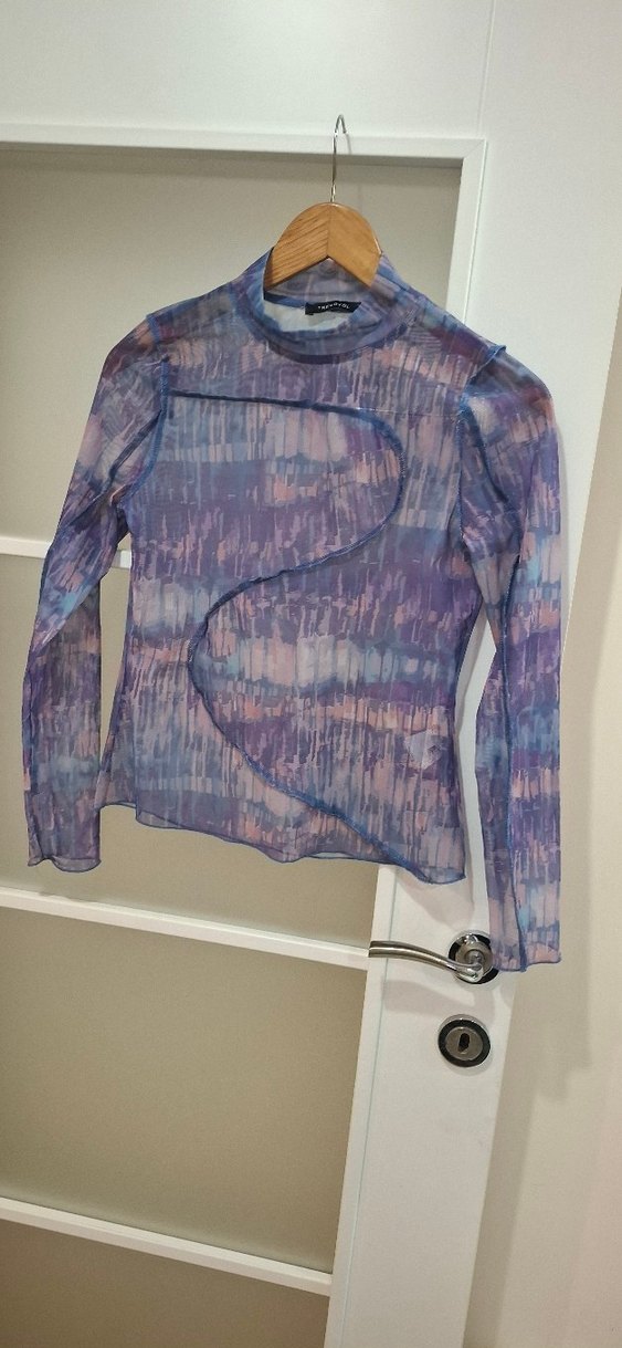 Mor lila mavi tül bluz. iç gösterir. Askılı bluzla giyilmeli. Sadece yıkandı giyilmedi.