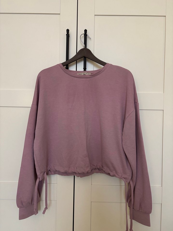 M beden İki koltuk arası 61,5 cm Uzunluk 48 cm Mor, uzun kollu, yuvarlak yakalı, bol kesim ve midi boy sweatshirt. Alt kısmında bağcık detaylarıyla rahat ve şık bir sokak stili sunar. Lcw spor giyim. Kumaşı güzel yumuşak.