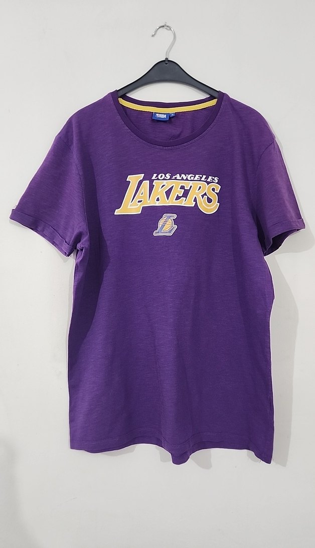 Mor renkte, baskılı Los Angeles Lakers logosu bulunan, yumuşak kumaştan, rahat kalıplı bir erkek tişörtü.