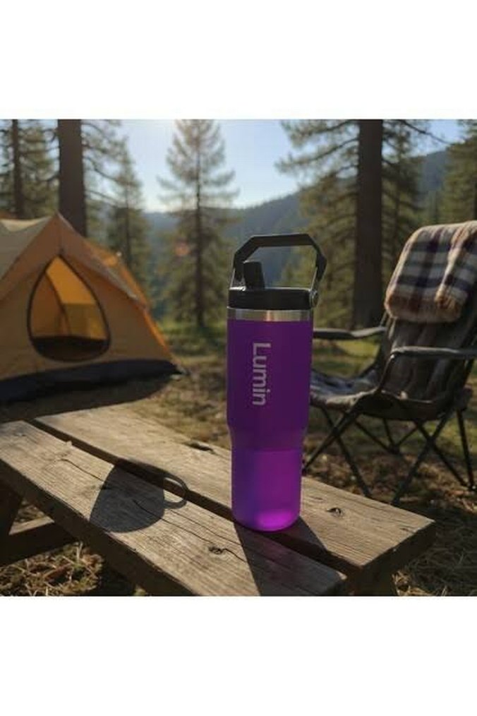 Mor renkli Lumin termos matara, gri sap ve kapak detaylarına sahiptir. İçecekleri sıcak veya soğuk tutar, taşıması kolaydır.