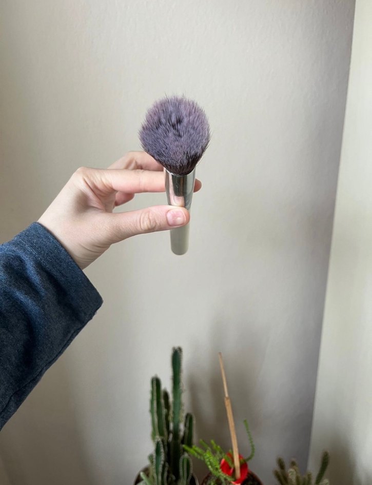 Mor yumuşak kıllara ve gri saplı makyaj fırçası, pürüzsüz uygulama sağlar. ️