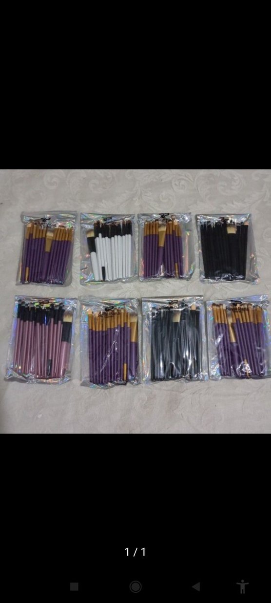 Mor saplı ve altın detaylı makyaj fırçası setleri, çeşitli stillerde ve şeffaf poşetlerde paketlenmiş. Farklı makyaj uygulamaları için uygun.