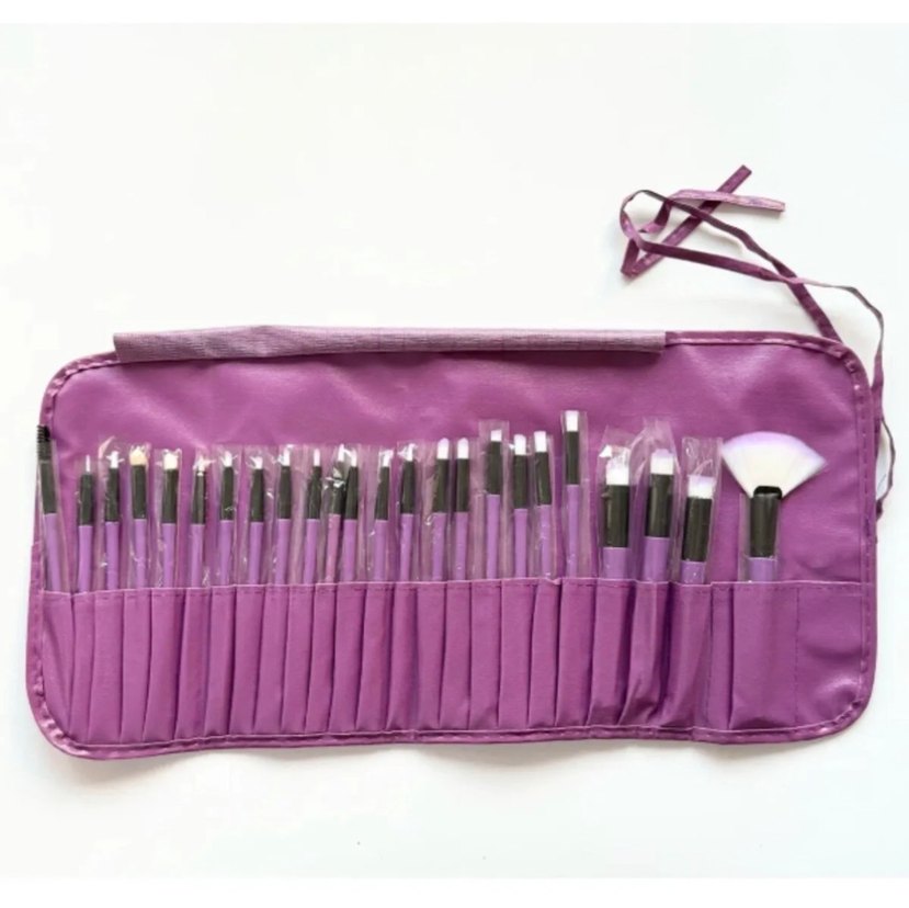 Farklı tipte fırçalardan oluşan, mor renkte ve rulo çantasında düzenli makyaj fırçası seti. ️ 24’lü