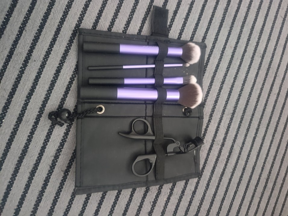 Yumuşak kıllı mor saplı makyaj fırçaları ve iki siyah metal aksesuar, siyah katlanabilir kılıfta düzenlidir.