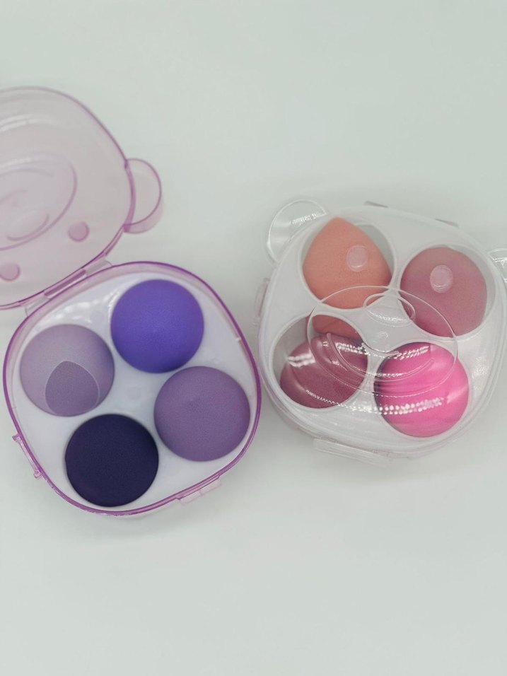 Farklı tonlarda 4 mor makyaj süngeri, şeffaf ayıcık şeklinde taşınabilir kutuda sunuluyor. Pürüzsüz makyaj için uygundur.
