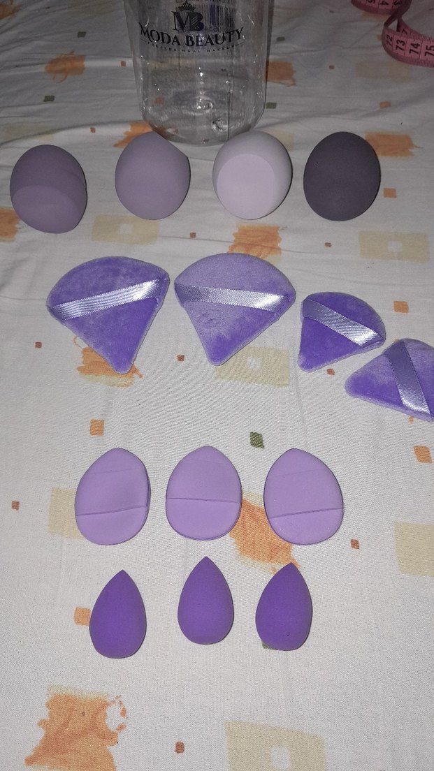 Pastel mor tonlarında farklı şekil ve boyutlarda makyaj süngerleri kavonoz kutuda