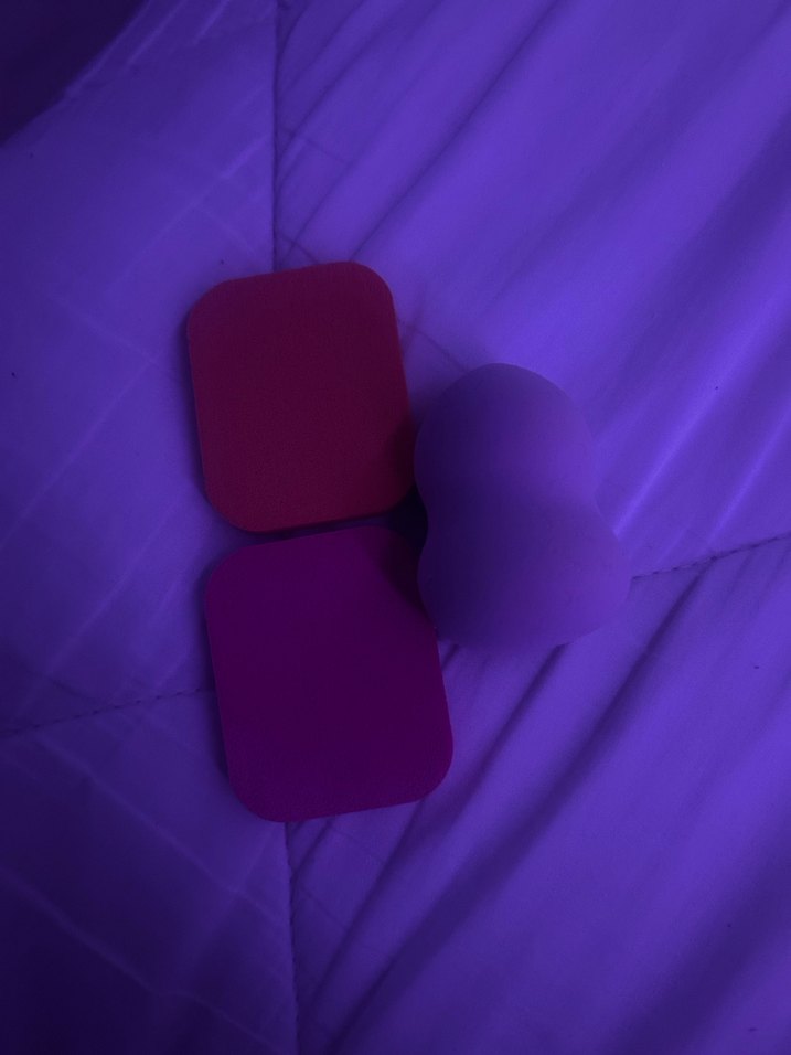 Koyu mor tonlarında bir makyaj süngeri ve iki kare aplikatörden oluşan set, pürüzsüz makyaj uygulaması için uygundur.