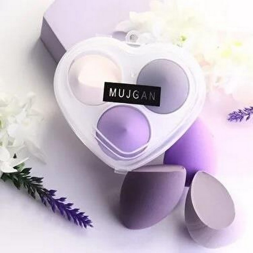 MUJGAN marka, kalp şeklinde kutuda üç adet açık mor ve beyaz makyaj süngeri seti, pürüzsüz uygulama sağlar.