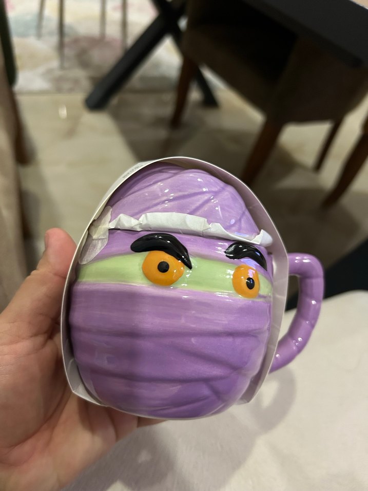 Pastel mor renkte, maske takmış figür şeklinde tasarlanmış, kulplu eğlenceli bir kupa. ☕ boya hataları var flying tiger sıfır kupa resimleri inceleyiniz