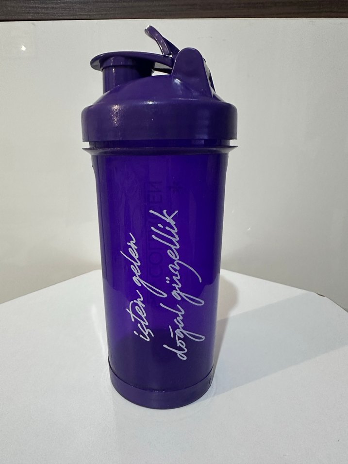 Kilitli kapaklı, üzerinde yazı bulunan koyu mor renkli matara.Kullanımı kolay ve dayanıklıdır. Hiç kullanılmadı