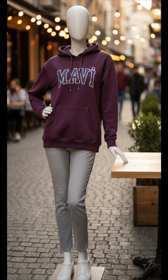 Mor renkte, kadın sweatshirt. Yumuşak ve sıcak kumaştan, önünde "MAVI" baskısı ve kanguru cepli.