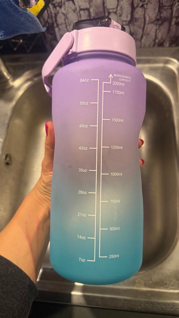 Mor-mavi tonlarında, 250ml'den 2000ml'ye kadar ölçü birimleri bulunan su şişesi, su tüketimini takip etmeyi kolaylaştırır. Taşıma için sağlam sapı vardır. Motivasyon su matarası 2 lt