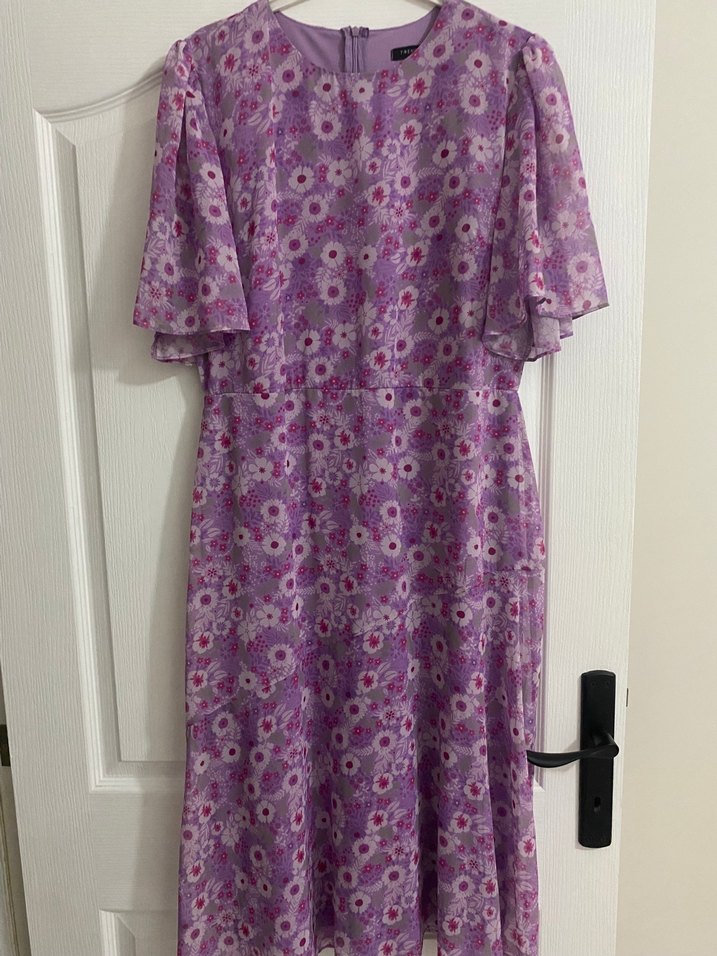Bu mor midi elbise, kısa kollu ve yuvarlak yakalı bol kesimdir. Pastel çiçek desenli ve dantel detaylıdır, vintage bohem tarzı sunar. Ofis için uygundur.