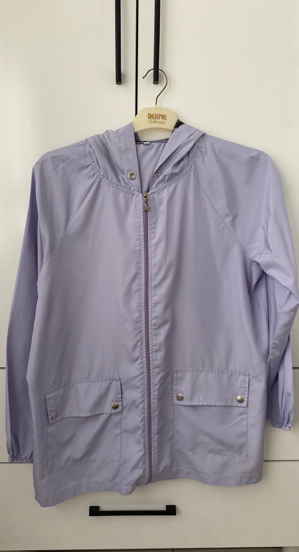 Mor midi boy fermuarlı yağmurluk, yakası kesik ve uzun kolludur. Rahat kesimi ve sentetik kumaşıyla günlük sokak stiline uygundur. ️