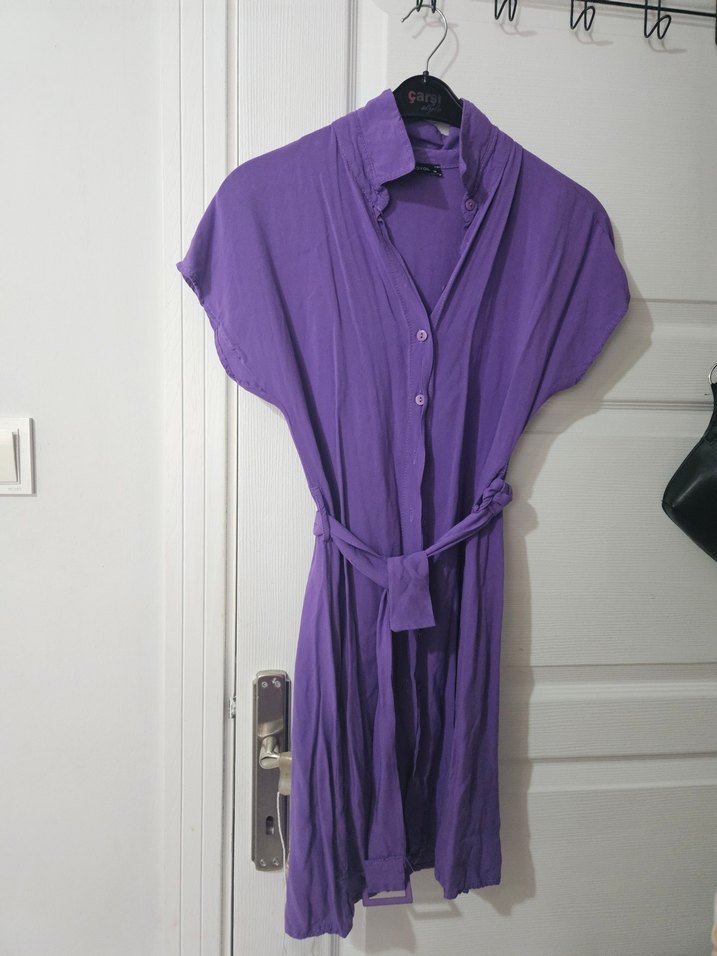 Mor renkte, midi boy ve bol kesim kadın gömlek elbise. Kısa kollu, beli kuşaklı ve düğmeli, sade ve minimalist tarzda.