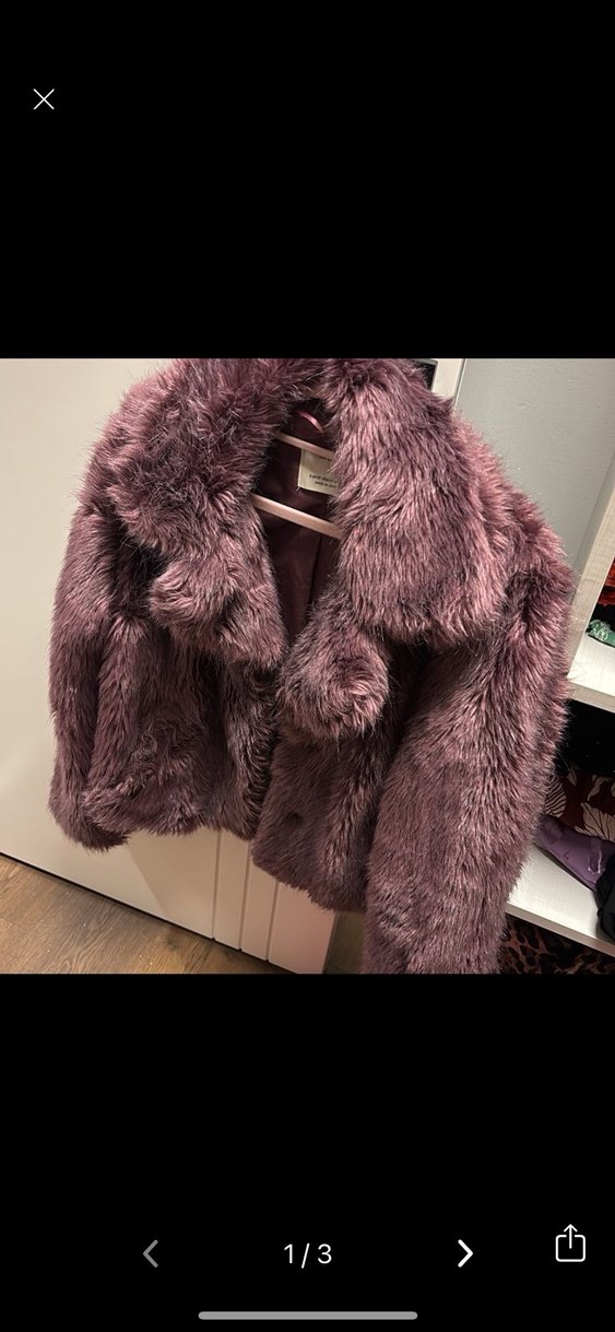 Koyu mor renkte, uzun kollu ve yakası kesik detaylı, kadınlar için midi boy kürk görünümlü ceket. Yumuşak ve sıcak tutan kumaşı günlük sokak tarzı için uygundur.