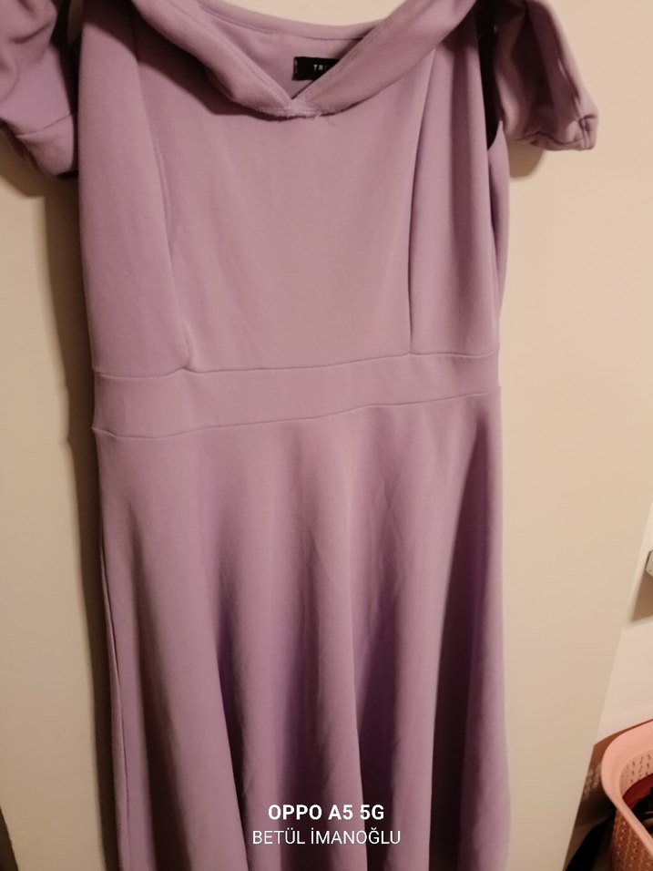 Pastel mor renkte, salaş kesim, drapeli kayık yaka ve kısa kollu midi boy kadın elbise, minimalist sokak tarzına uygundur.