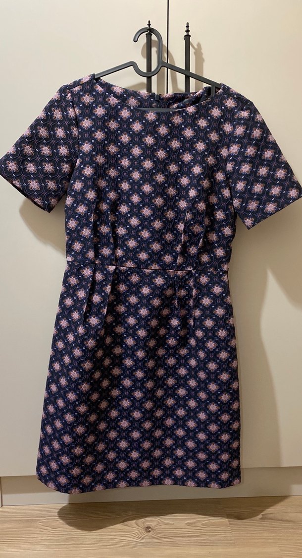 Kısa kollu, yuvarlak yakalı mor midi boy elbise. Piliseli ve batik desenli, ofis için uygun regular kesim. Hafif sentetik kumaştan, bohem Paris tarzı. M beden ama s beden daha uygun yıpranması yok yepyeni alan pişman olmaz