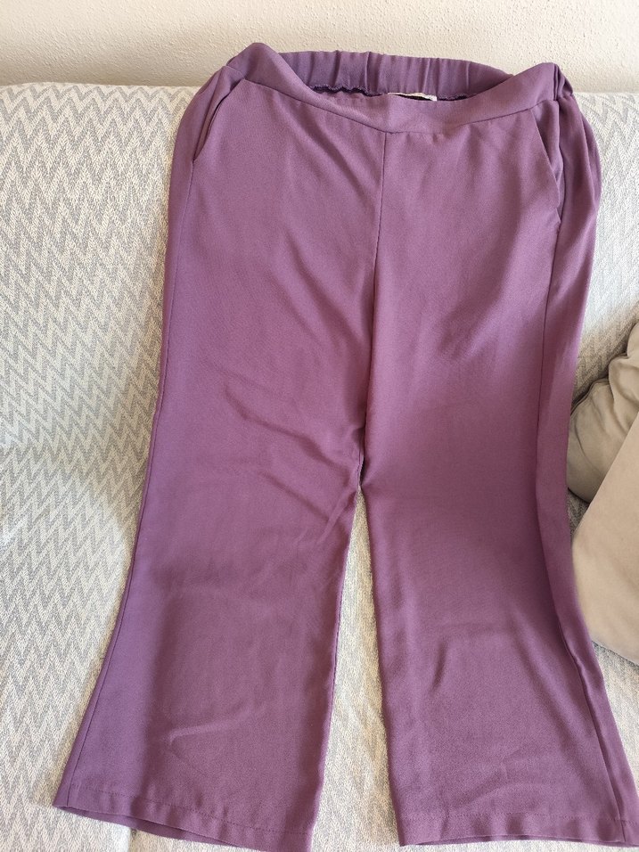Pastel mor renkte, midi boy ve rahat kesim kadın pantolon. Yumuşak sentetik kumaştan üretilmiş, günlük kullanım için uygundur.