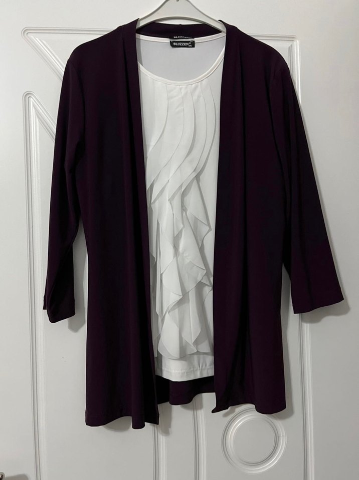 Mor renkte, midi boy ve salaş kesim hırka. Uzun kollu, drapeli ve yuvarlak yakalı. Ofis için uygun, modern tarzda.
