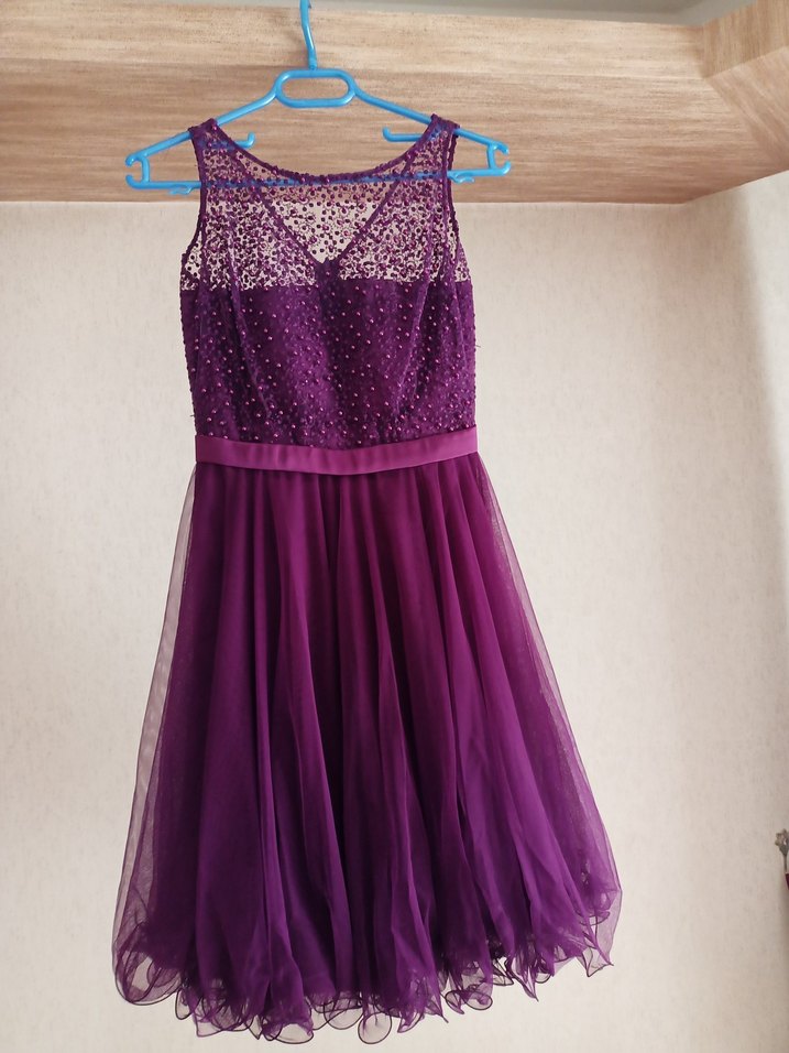 1 kere düğünde giyildi. Hassas bir elbise bazı boncukları düşmüş fotoğrafta da belli. Altanight İzmir'den alındı. Baştan başa tüm uzunluğu 85 cm. 1 Beden ancak dar. 32-34 bedene uyumludur. Çok güzel menekşe rengi altı tüllü içinde astarı var. Bele tam oturur. XXS XS UYUMLU. 32-34 BEDEN UYUMLU