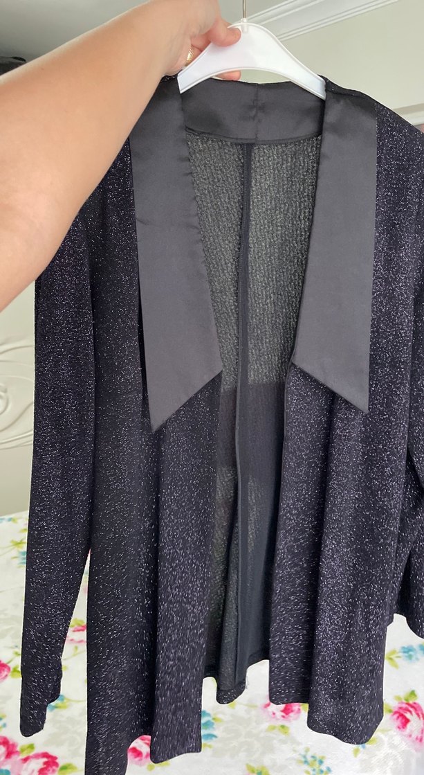 Mor midi boy, drapeli hamile ceketi, uzun kollu ve notched yaka detaylıdır. Sentetik kumaştan üretilmiş, ofis için uygundur.