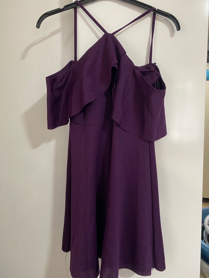 Mor midi uzunlukta, drapeli askılı ve straplez yaka detaylı, bol kesim modern ve minimalist kadın abiye elbise. Romantik akşamlar için uygun.