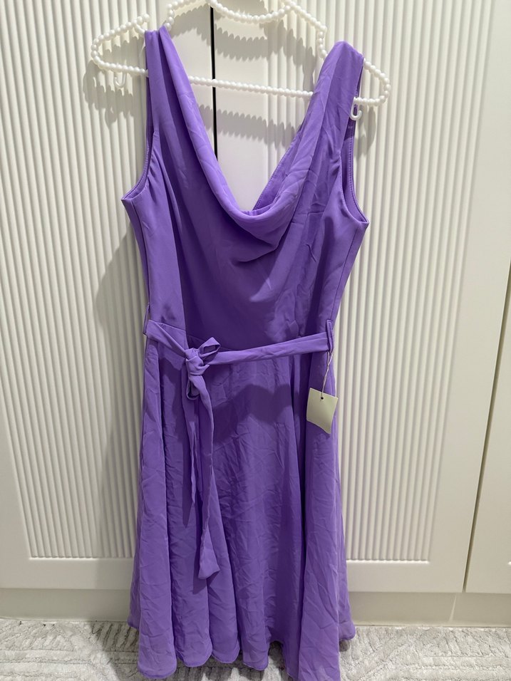 Mor renkte, drapeli V yaka ve bele bağlamalı, kolsuz midi uzunlukta, şık ve çağdaş tarzda parti elbisesi.