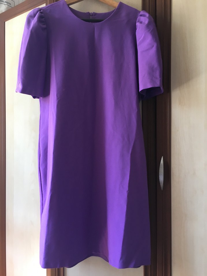 Mor kısa kollu, yuvarlak yakalı, bol kesim karpuz kol rahat elbise Parlak dokusu günlük kullanıma uygun.