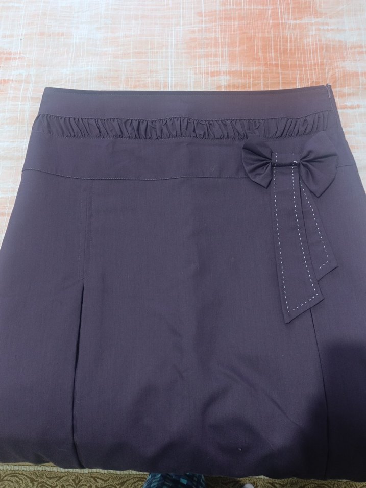 Mor midi regular fit kesim, fırfır ve fiyonk detaylarıyla ofis kullanımına uygundur.