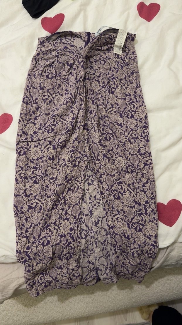 İpek gibi mor renkte, drapeli ve vücuda oturan bohem tarzda midi hamile eteği. Günlük kullanım için uygun, retro havası taşıyor.